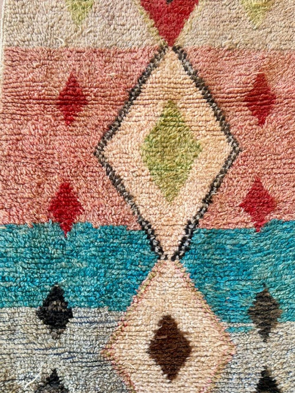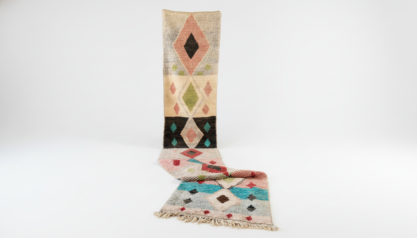 This long Boujad runner stretches like a story across your space, guiding the eye through a rhythm of geometric symbols, soft tones, and bold accents. Each section feels like a chapter: warm neutrals melt into earthy blacks, then burst into unexpected touches of turquoise, coral, and sage.