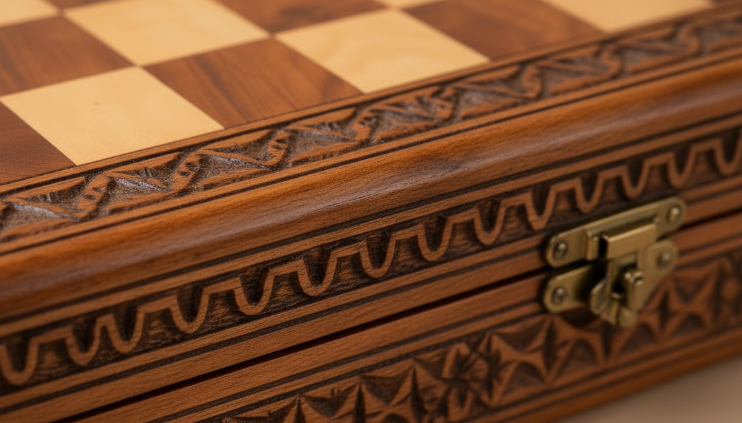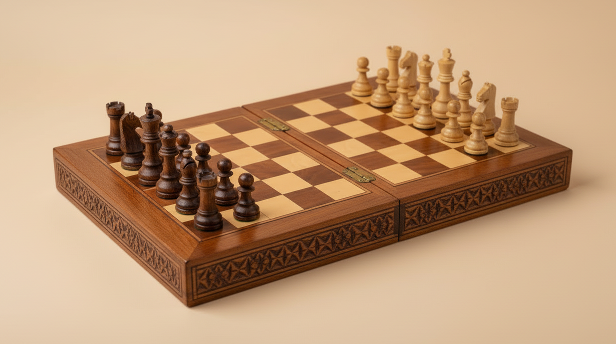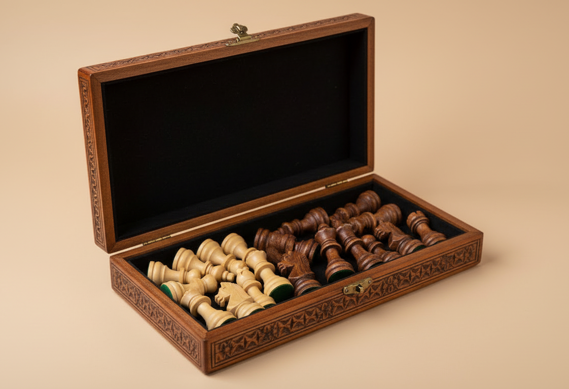 The box opens into a full chessboard, revealing a neatly organized interior to store all pieces securely. Each chess piece is carefully shaped from natural wood, offering a warm, authentic feel with every move.