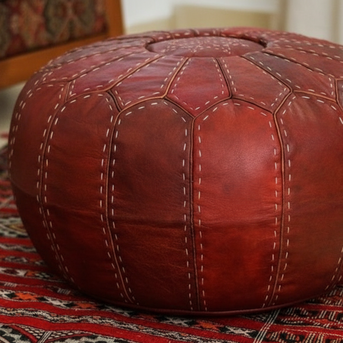 Its rich red tone adds depth and character to any interior, whether placed in a modern living room, a cozy reading corner, or a bohemian-inspired space. The detailed hand-stitching and structured shape make it both a decorative and functional piece.