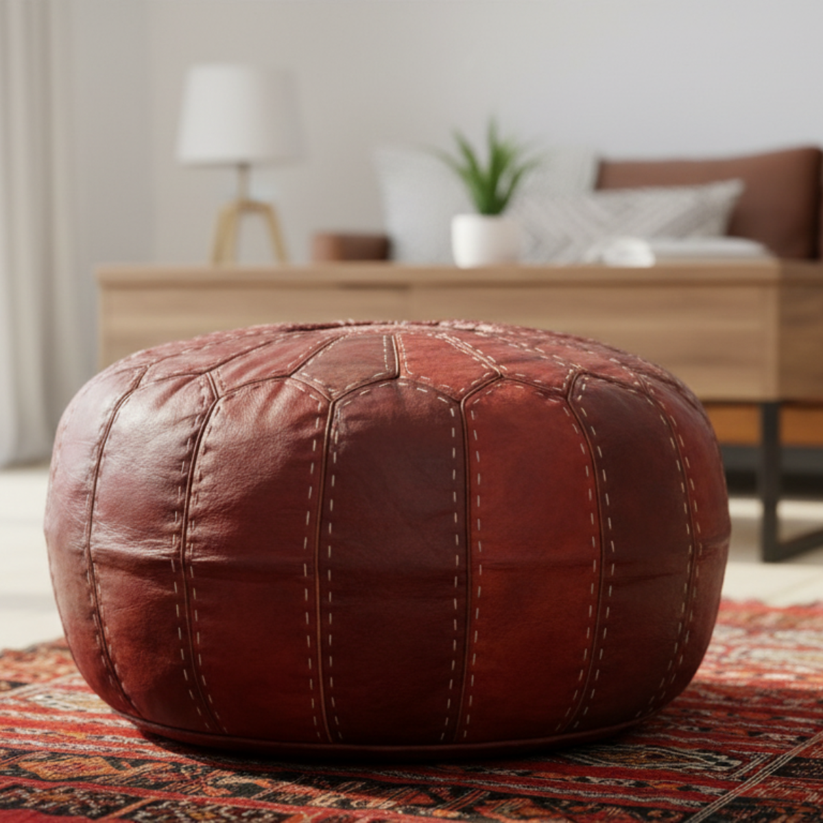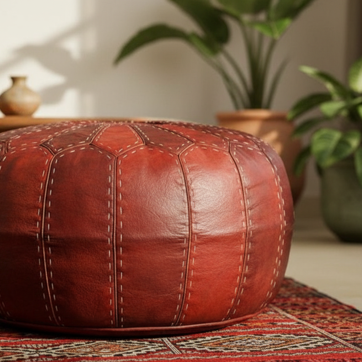 Bring warmth and authentic Moroccan craftsmanship into your space with this beautifully handcrafted leather pouf. Made from high-quality genuine leather and carefully stitched by skilled artisans, this piece combines tradition with timeless design.