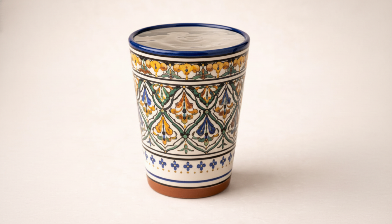 Enjoy traditional Moroccan tea culture with this handmade Moroccan pottery Ghouraffe cup, a beautifully crafted ceramic cup inspired by centuries of Moroccan artisan tradition. Carefully shaped from natural clay and decorated by hand, this cup reflects the vibrant artistic heritage of Moroccan pottery.